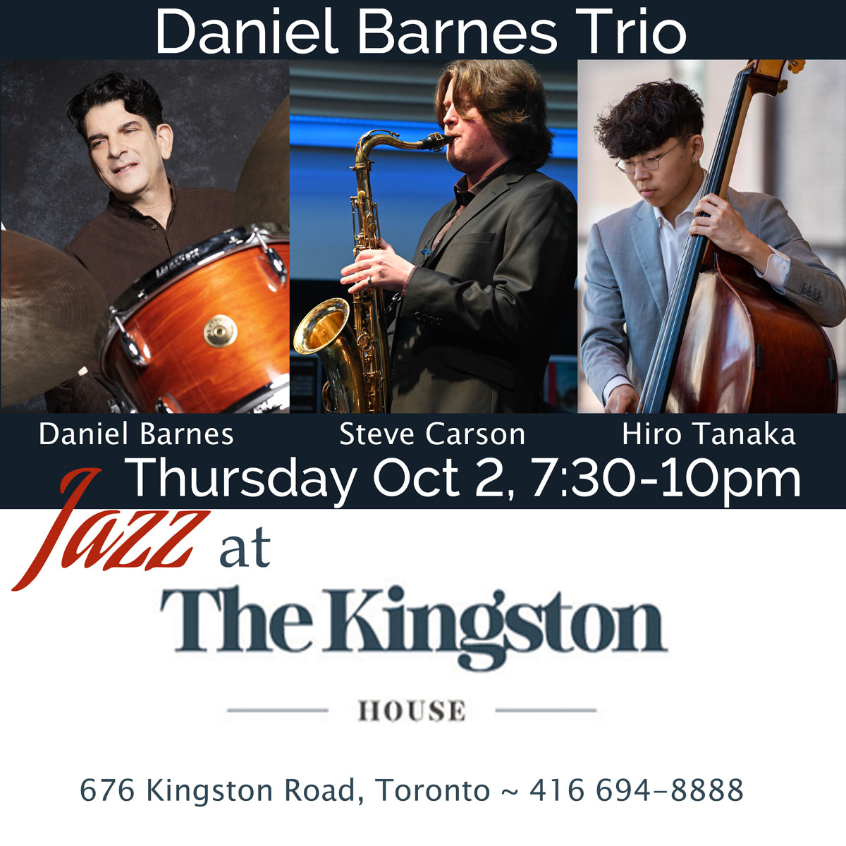 Drummer Daniel Barnes trio with Steve Carson on tenor sax and Hiro Tanaka on bass. Playing originals, jazz standards and music by great jazz artists. Main dining room, no cover
