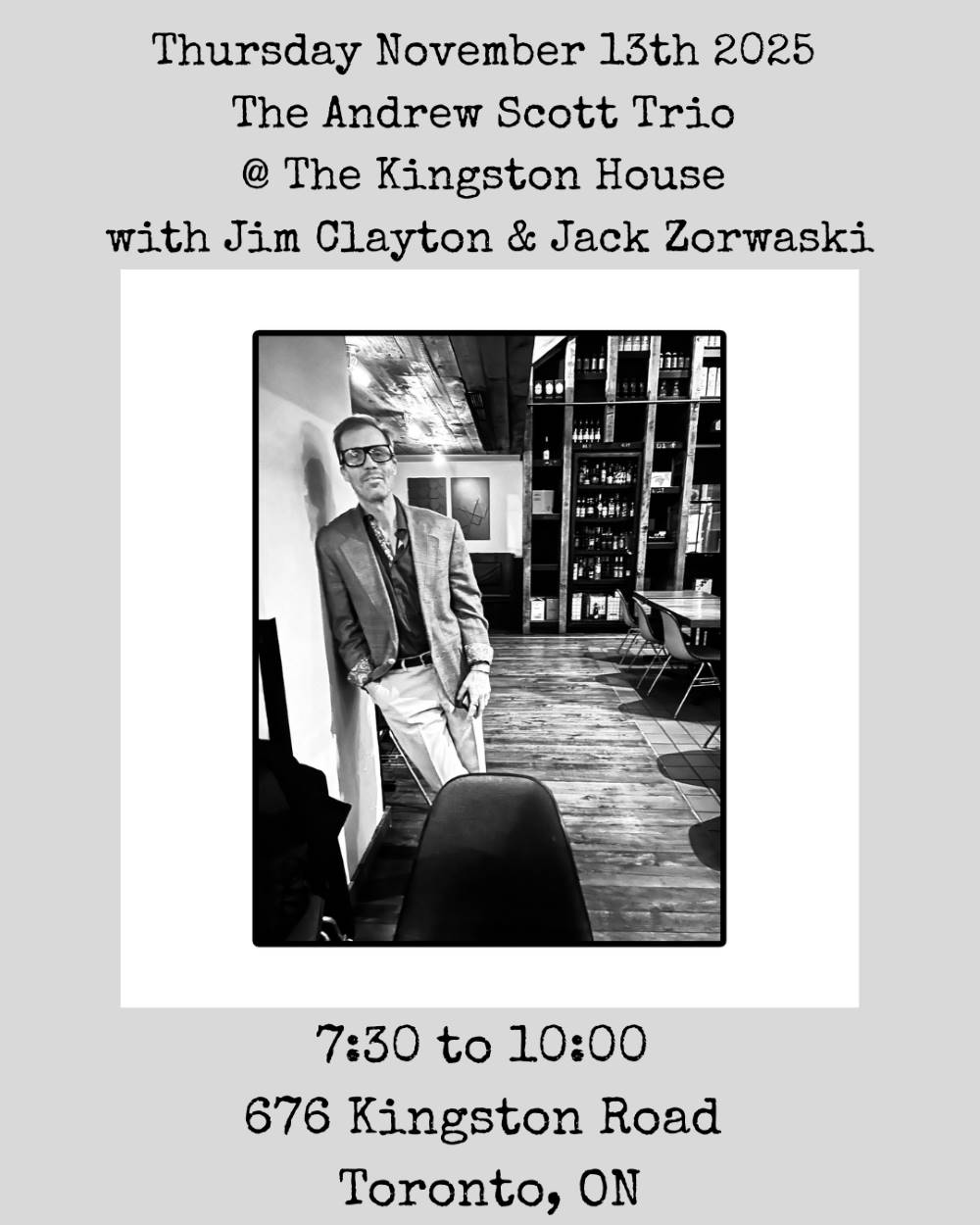 Vocalist Jack Ridout’s deep resonant tones and Lenny Graf’s lilting flute, clarinet & sax will be backed by the solid rhythm of Peter Hill on keys & Ron Johnston on bass. And a few surprise musical guests will add to the mix! Downstairs event room
