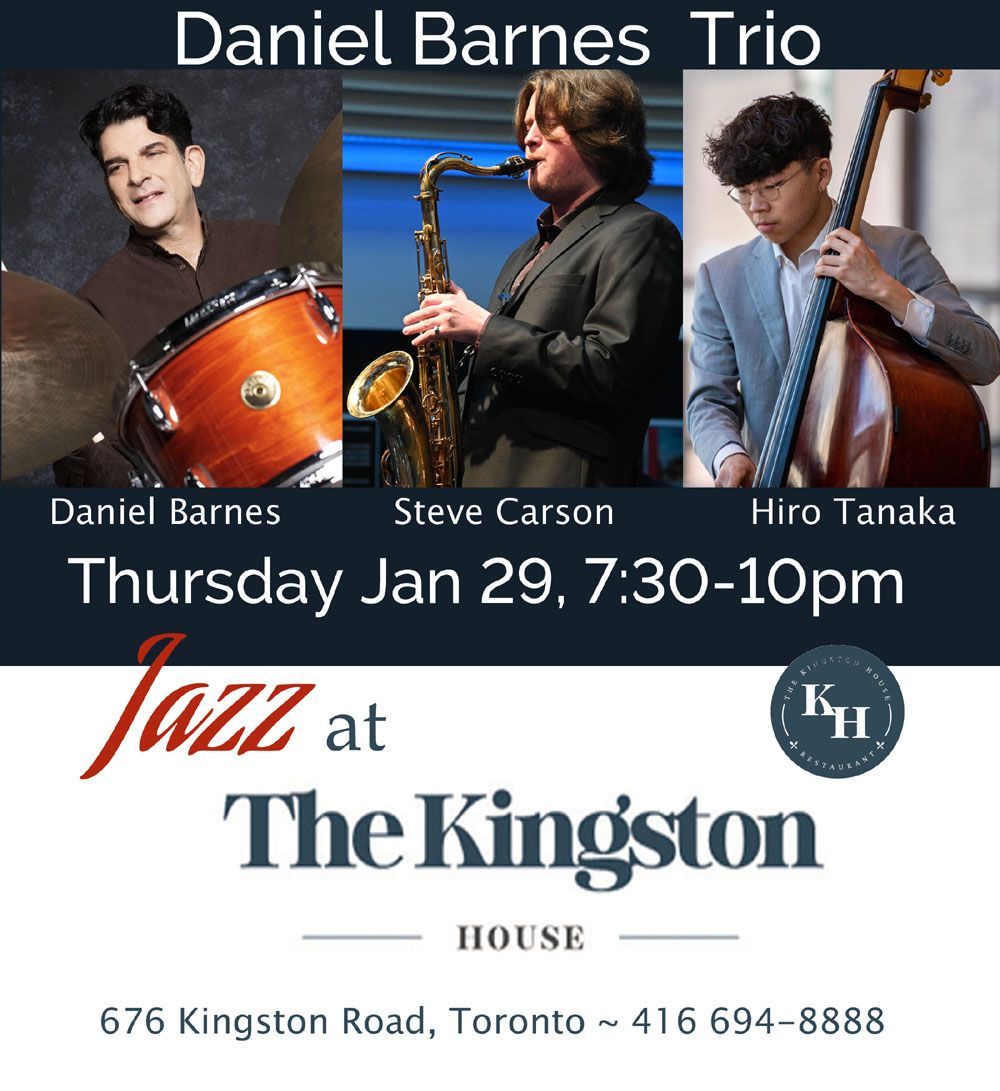 Drummer Daniel Barnes trio with Steve Carson on tenor sax and Hiro Tanaka on bass. Playing originals, jazz standards and music by great jazz artists. Main dining room, no cover |